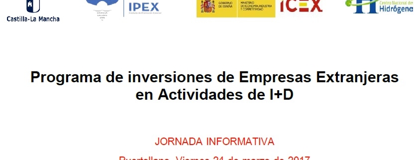 Última modificación 05 marzo, 2019[:es]El 24 de marzo de 2017, tendrá lugar en las instalaciones del Centro Nacional del Hidrógeno (CNH2) en Puertollano (Ciudad Real), la jornada informativa sobre el “Programa de Inversiones de Empresas Extranjeras en Actividades de I+D”, cuyo objetivo es el de informar sobre la Convocatoria de este programa que pretende fomentar el […]