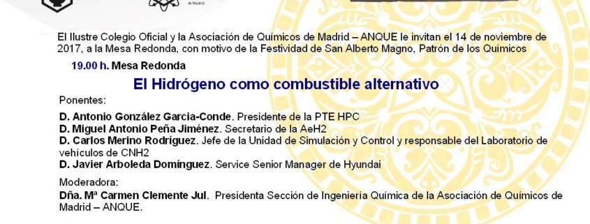 Última modificación 05 marzo, 2019[:es]El Centro Nacional del Hidrógeno participó en la Mesa Redonda “El Hidrógeno como combustible alternativo” organizada por el Colegio Oficial y la Asociación de Químicos de Madrid (ANQUE), que tuvo lugar el pasado 14 de noviembre con motivo de la celebración de la San Alberto Magno. En ella participaron Antonio Gonzalez […]